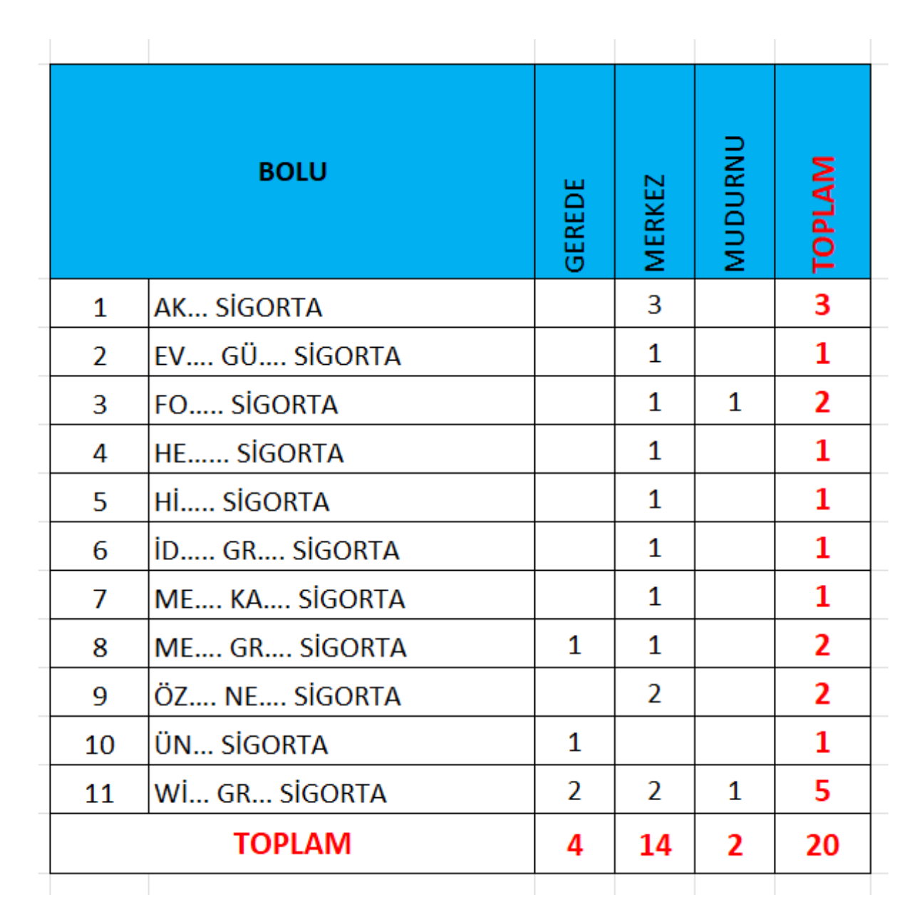 Bolu İl ve İlçe Bazlı Sigorta Acentesi Şube Sayısı