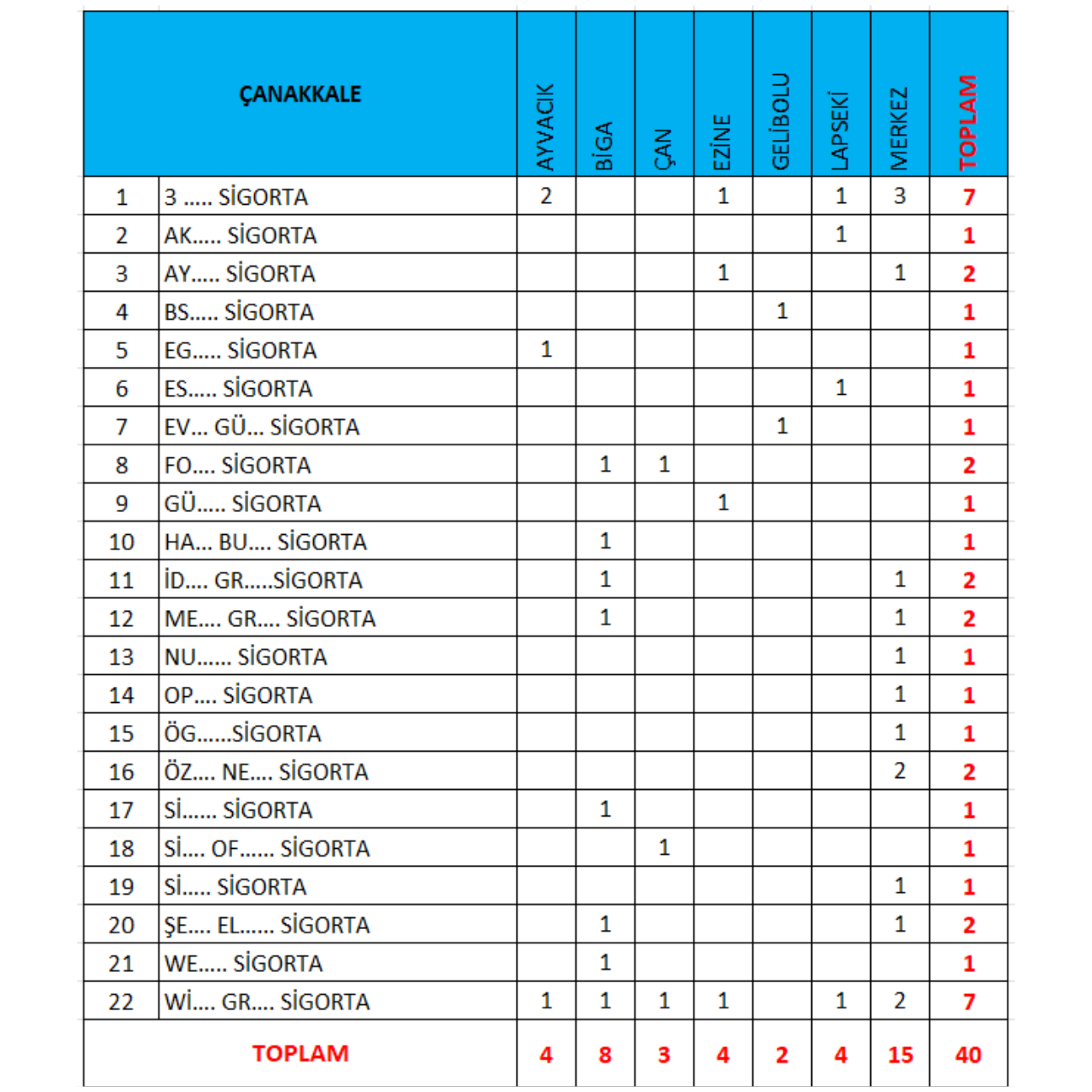 Çanakkale İl ve İlçe Bazlı Sigorta Acentesi Şube Sayısı