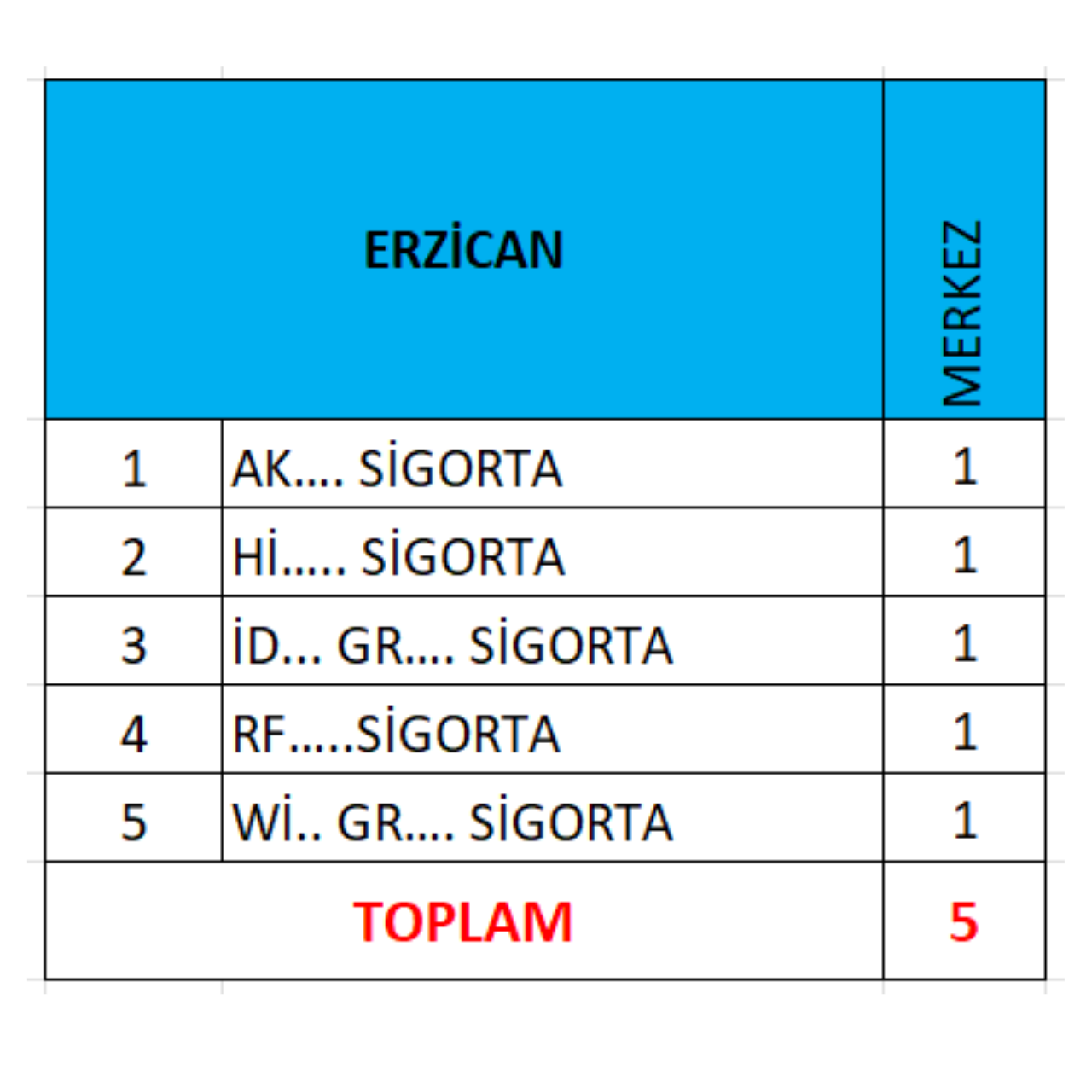 Erzincan İl ve İlçe Bazlı Sigorta Acente, Sigorta Broker Şube Sayısı