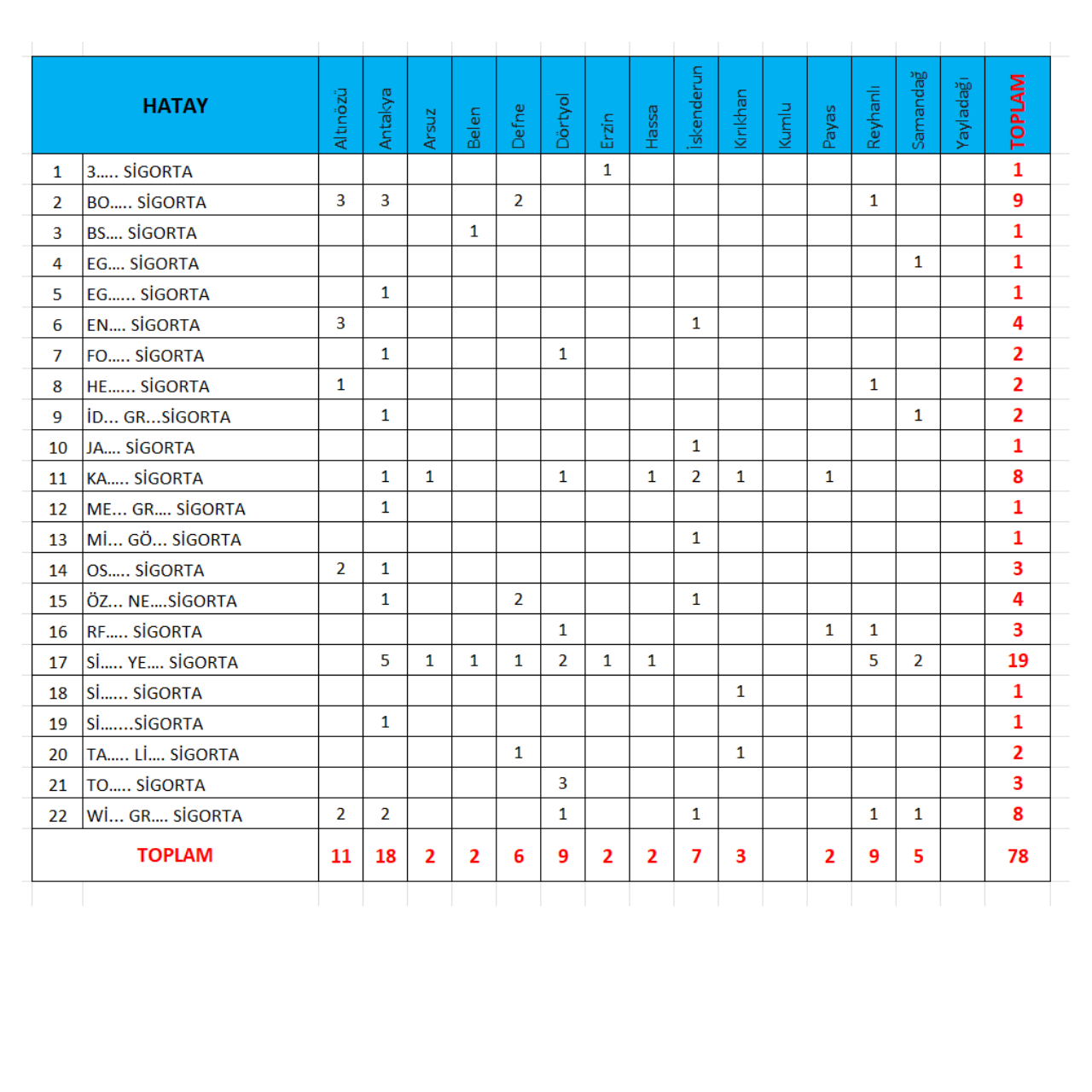 Hatay İl ve İlçe Bazlı Sigorta Acente, Sigorta Broker Şube Sayısı