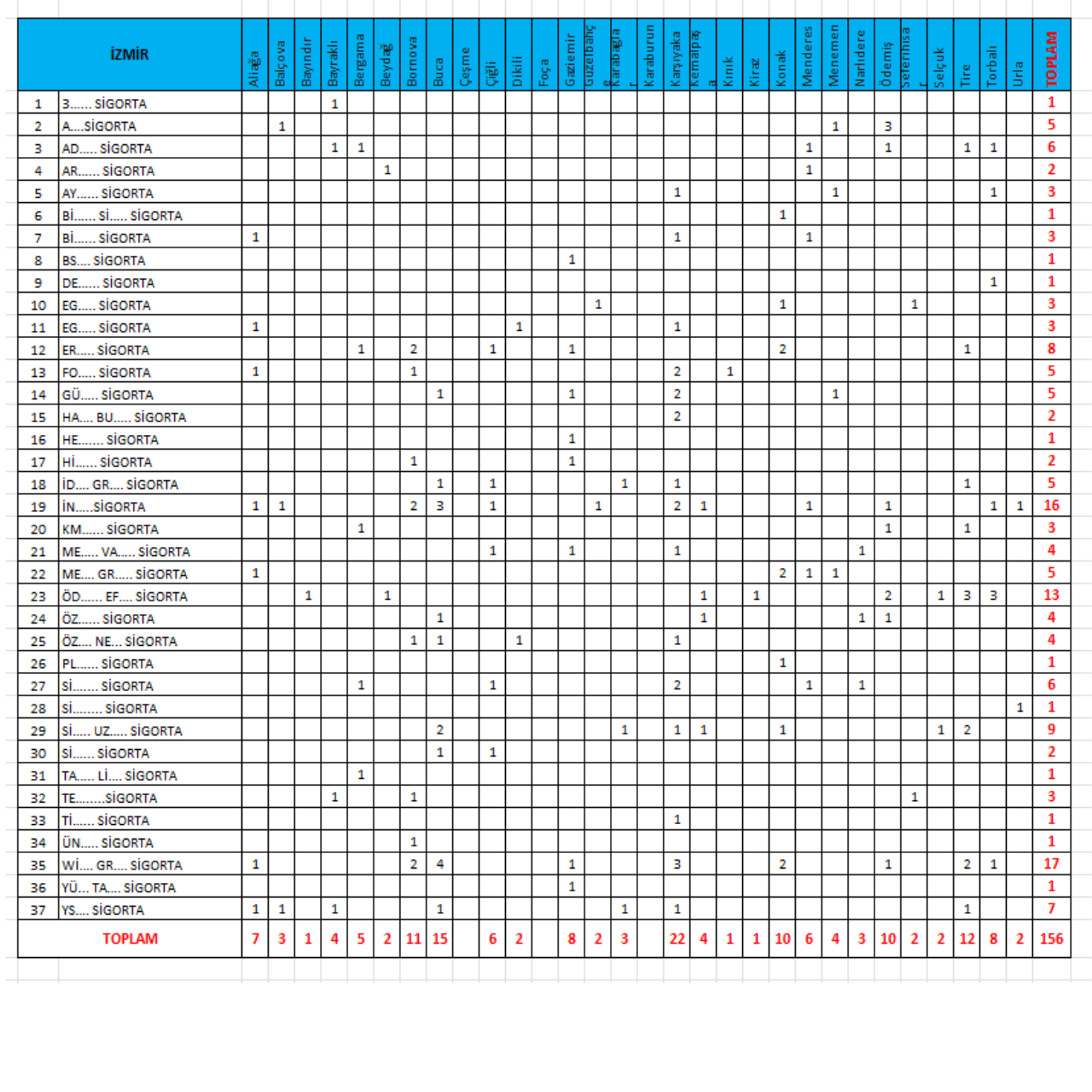 İzmir İl ve İlçe Bazlı Sigorta Acentesi Şube Sayısı