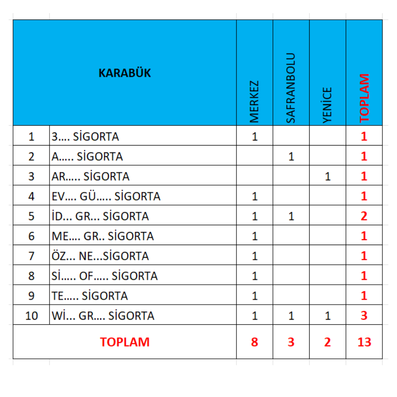 Karabük İl ve İlçe Bazlı Sigorta Acente, Sigorta Broker Şube Sayısı