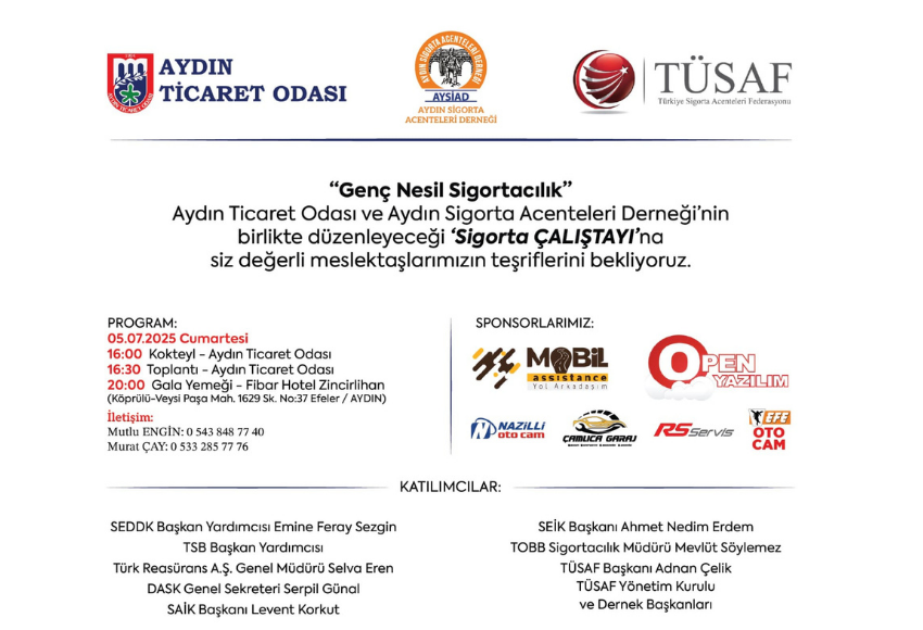 Aydın Ticaret Odası ve Türkiye Sigorta Acenteleri Fedarasyonu üye derneklerinden Aydın Sigorta Acenteleri Derneği tarafından düzenlenen Sigorta Çalıştayı 5 Temmuz cumartesi günü Aydın Ticaret Odası’nda gerçekleştirilecektir. 5 Temmuz 2025 tarihinde saat 16.00’da Aydın Ticaret Odası’nda gerçekleştirilecek, Aydın Ticaret Odası ve Aydın Sigorta Acenteleri Derneği tarafından düzenlenen Genç Nesil Sigortacılık Çalıştayı’na […]