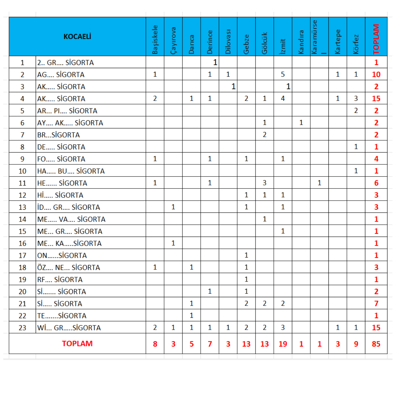 Kocaeli İl ve İlçe Bazlı Sigorta Acente, Sigorta Broker Şube Sayısı