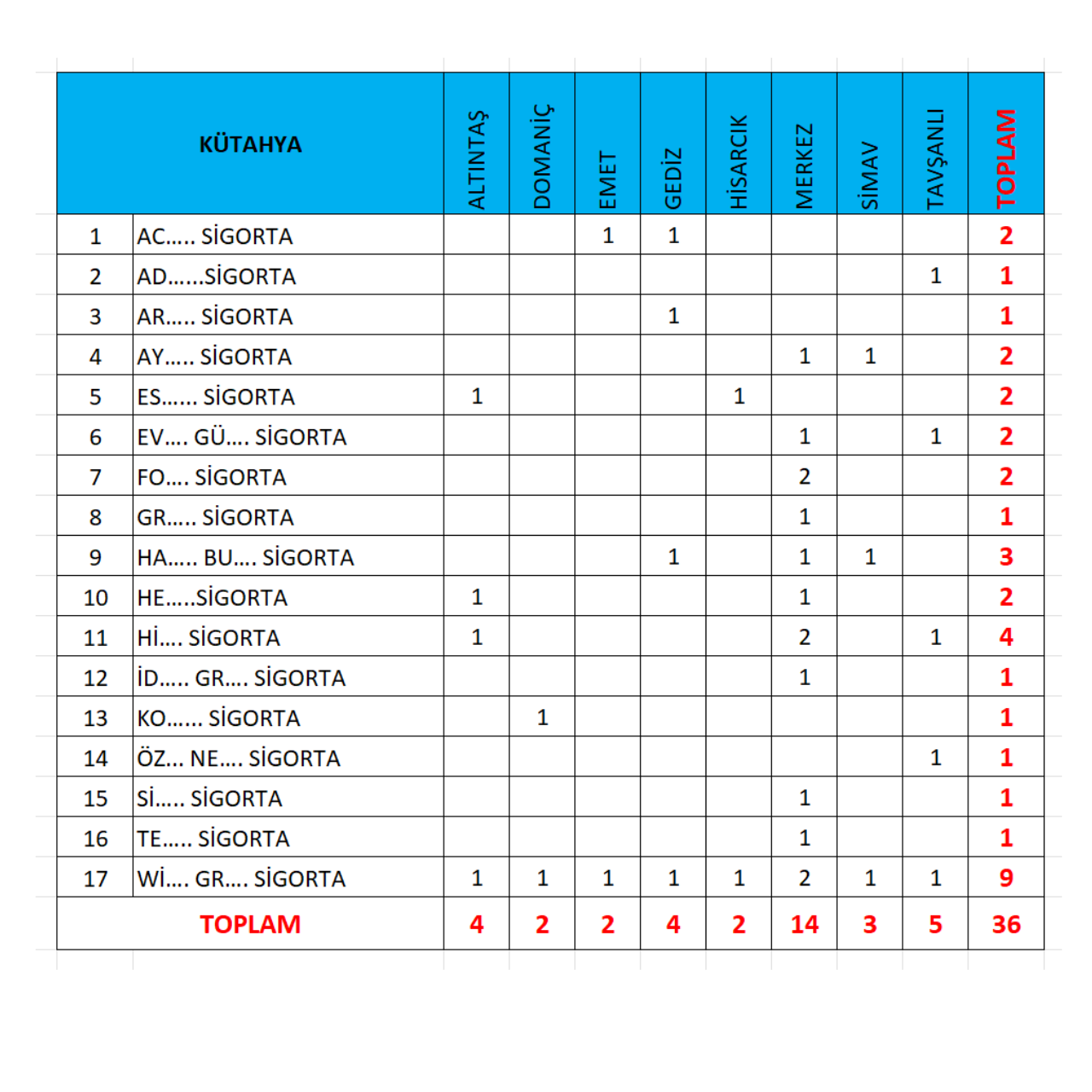 Kütahya İl ve İlçe Bazlı Sigorta Acente, Sigorta Broker Şube Sayısı