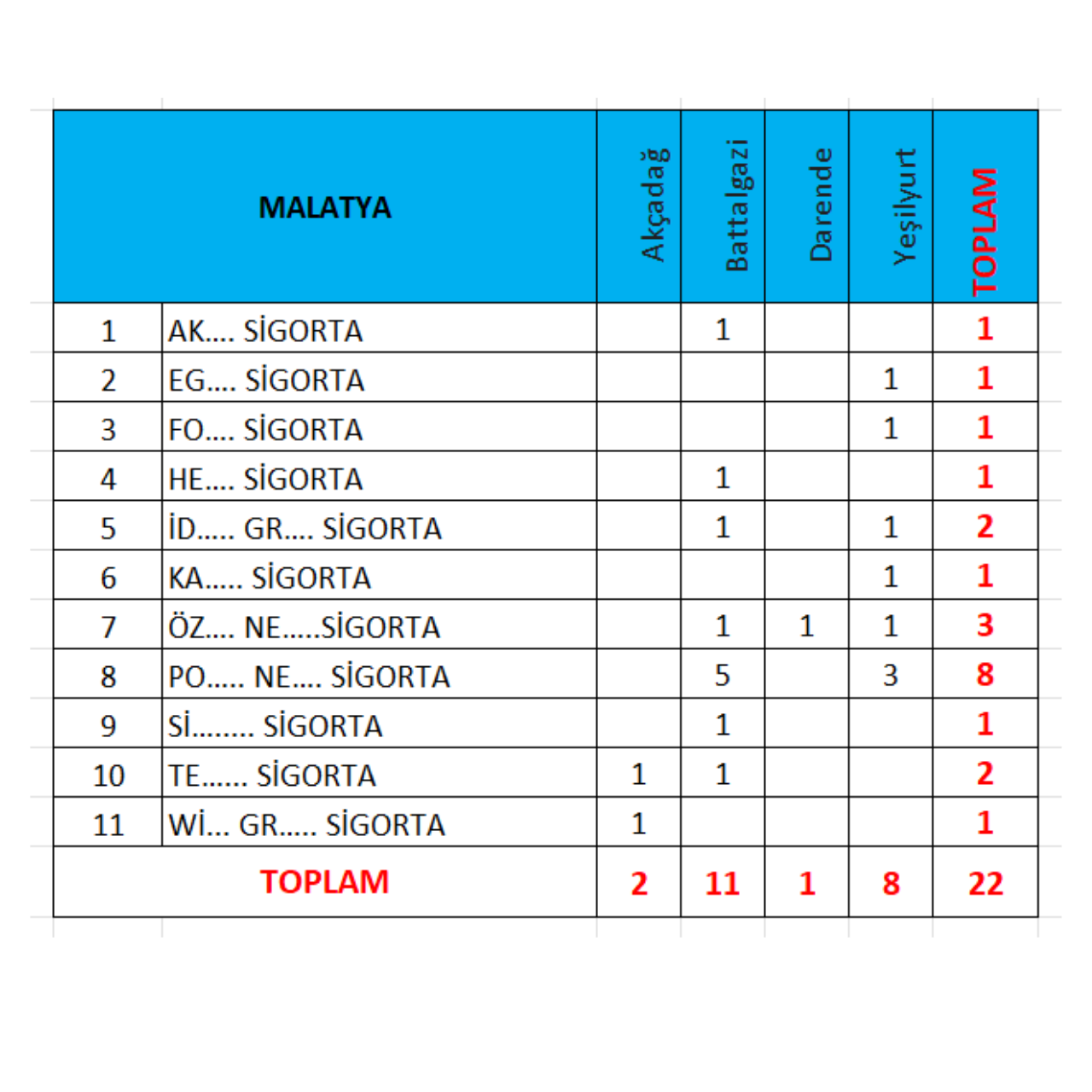 Malatya İl ve İlçe Bazlı Sigorta Acente, Sigorta Broker Şube Sayısı