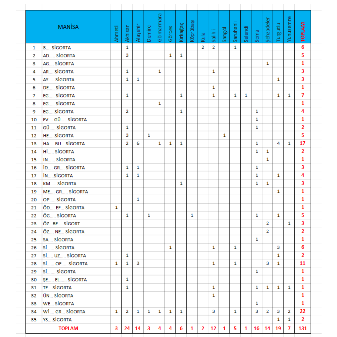 Manisa İl ve İlçe Bazlı Sigorta Acente, Sigorta Broker Şube Sayısı