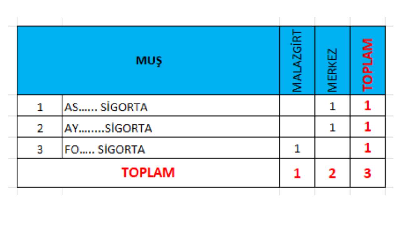 Muş İl ve İlçe Bazlı Sigorta Acente, Sigorta Broker Şube Sayısı