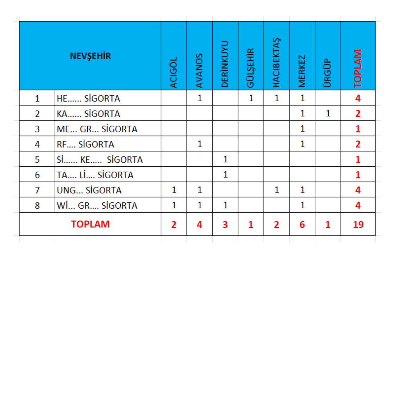 Nevşehir İl ve İlçe Bazlı Sigorta Acente, Sigorta Broker Şube Sayısı