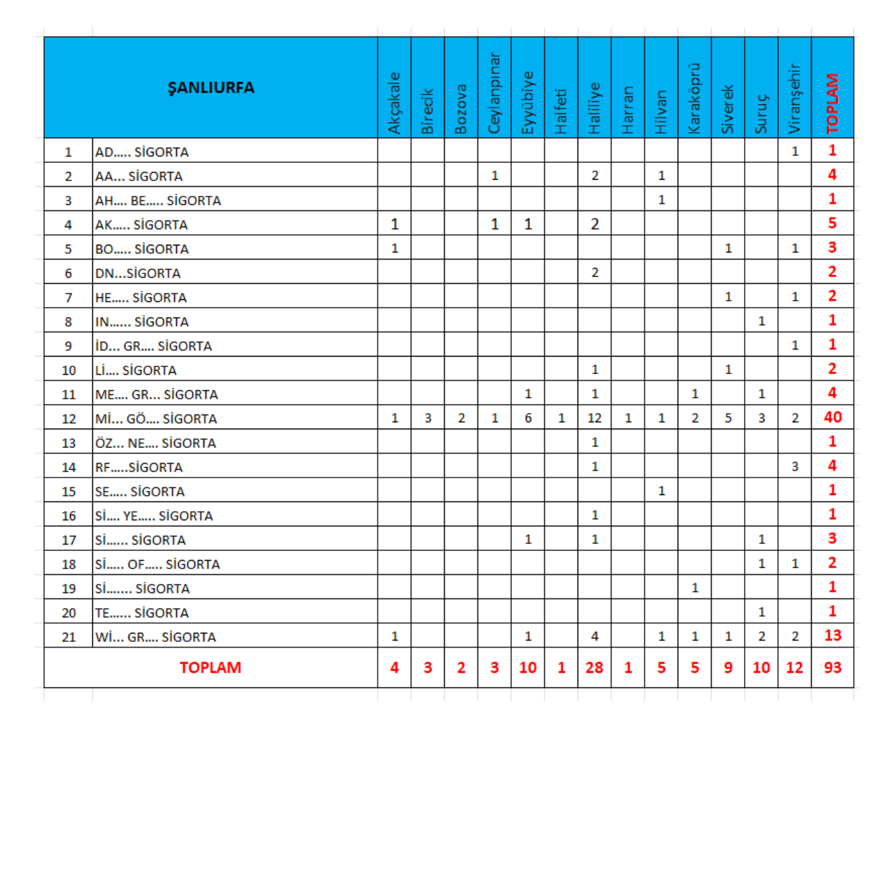 Şanlıurfa İl ve İlçe Bazlı Sigorta Acente, Sigorta Broker Şube Sayısı