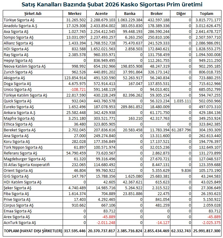 Şubat 2026 ayı itibarıyla 25 milyar 991 milyon TL olan Kasko sigortası prim üretiminin 20 milyar 371 milyon TL’sini Sigorta Acenteleri, 2 milyar 855 milyon TL’sini Sigorta Brokerleri, 2 milyar 385 milyon TL’sini ise Bankalar üretmiş. Diğer taraftan şirket merkez üretimi ise 317 milyon TL olarak gerçekleşmiştir. Diğer satış kanalında ise 62 milyon TL prim üretimi olmuştur.