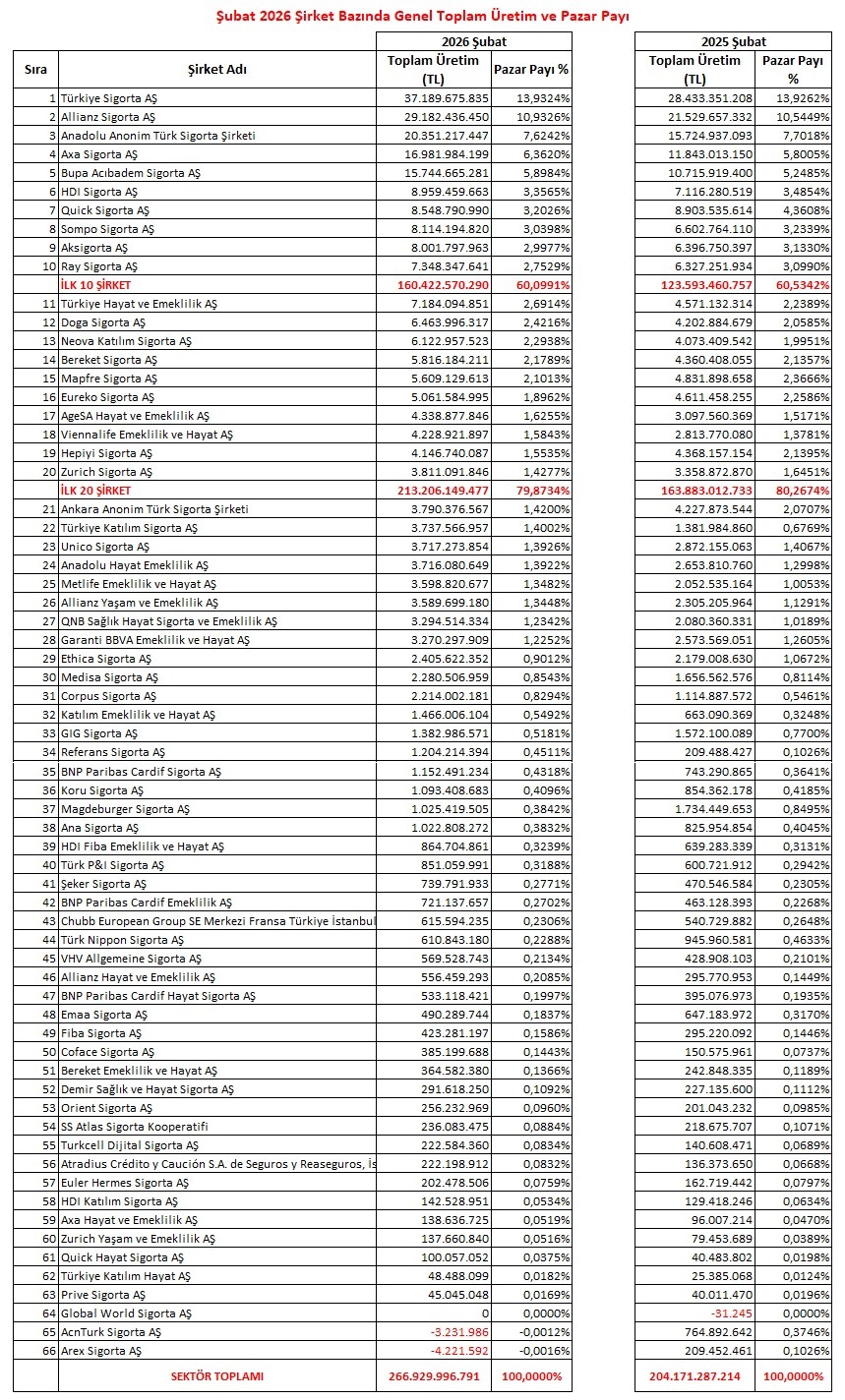 TSB verilerine göre, Şubat 2026 itibarıyla sektör 66 sigorta şirketi ile toplam 266 milyar 929 milyon TL prim üretimi gerçekleşmiştir. Yine diğer branşlarda olduğu gibi genel üretim toplamında da sistem değişmedi,  ilk on %60,  ikinci on %20 toplamda %80 pazar payı ile sektörün ana lokomotifi olduklarını gösterdiler.