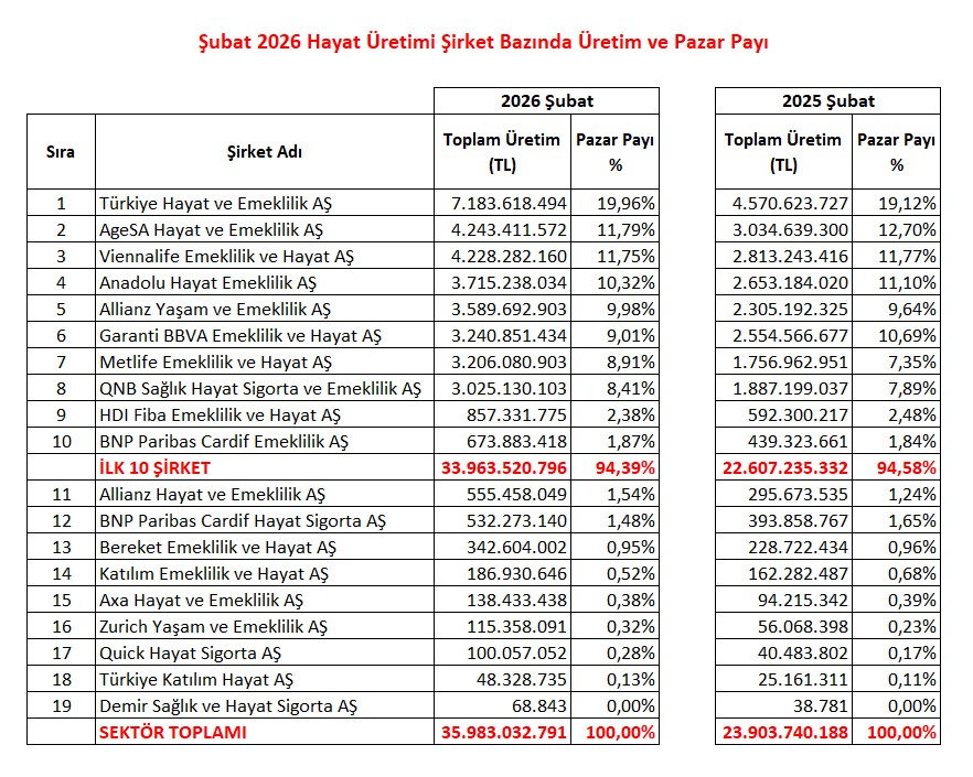 TSB verilerine göre Şubat 2026 ayı itibarıyla 35 milyar 983 milyon TL Hayat sigortası prim üretimi gerçekleşmiştir. Şirketlerin  sıralamasına baktığımızda ise ilk on sigorta şirketi pazardan %94,39 oranla 33 milyar 963 milyon TL  prim üretimi yazmışlardır.