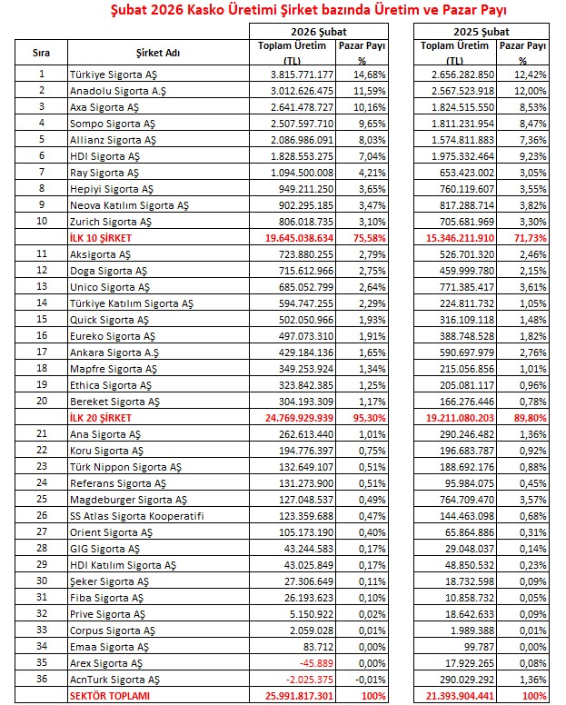 Şubat 2026 ayı itibarıyla 34 sigorta şirketi 25 milyar 991 milyon TL Kasko sigortası prim üretimi gerçekleştir. Sigorta şirketlerinin üretim ve pazar payına baktığımızda ise, ilk on şirket 19 milyar 645 TL  prim üretimiyle %75 pazar payına sahip olduğu gözlemleniyor.  İkinci on ise 5 milyar 124 milyon TL prim üretimi ve %19,72 ile pazardan payları almış görünüyor. TSB verilerine baktığımızda sektörün ilk yirmi şirketi şubat ayı itibarıyla kasko prim üretiminin %95,30’u gerçekleştirmiştir. Diğer üretim ve pazar paylarını aşağıdaki tablodan görebilirsiniz.