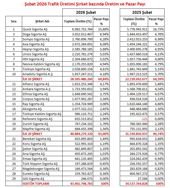 2026 Şubat ayı itibarıyla 43 milyar 254 milyon TL  Trafik sigortası prim üretimi gerçekleşti. Üretim sıralamasına baktığımızda ise  İlk on sigorta şirketinin toplam Trafik sigortası prim üretimi 28 milyar 505 milyon TL olurken yine ilk on şirketin pazar payının ise %64,84 olduğu görülüyor. Sıralamada ikinci on şirketin prim üretimi ise 12 milyar 378 milyon TL  ve %28,16 pazar payına sahip olmuştur.  Aşağıdaki tabloda trafik sigortası branşında sigorta şirketlerinin kümülatif olarak 2026 Şubat ayı prim üretimlerini ve pazar paylarını görebilirsiniz.