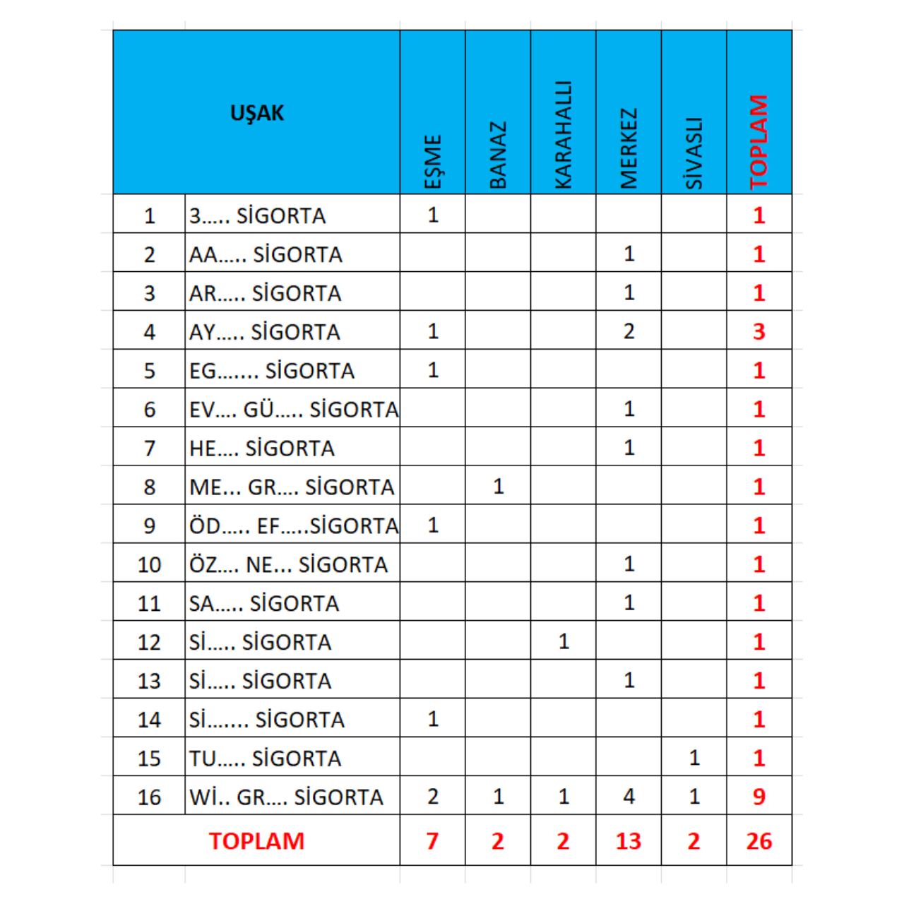 Uşak İl ve İlçe Bazlı Sigorta Acente, Sigorta Broker Şube Sayısı